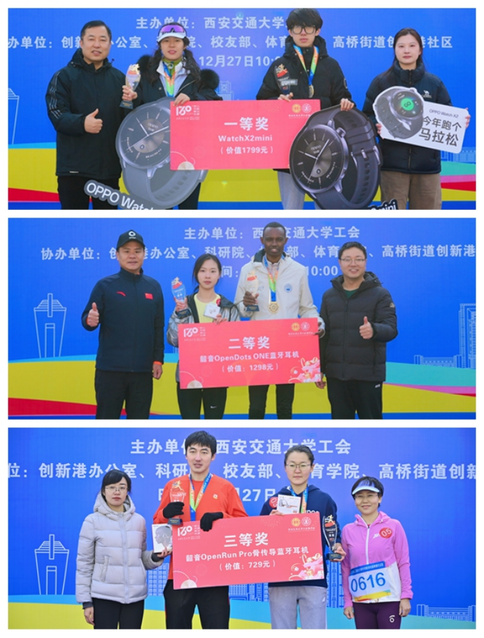 活动现场,高桥街道创新港社区、OPPO、韶音科技、西瑞粮油、Smart西安、浙商银行、华孚视界、苏宁易购、延长壳牌、跃动健身、中粮悠采、云上易行、华住集团、杨掌柜、张裕酒庄、泓理库迪等合作企业还为参赛运动员提供了各类补给和纪念品,学校后勤保障部提供了姜汁可乐,在此一并表达感谢!