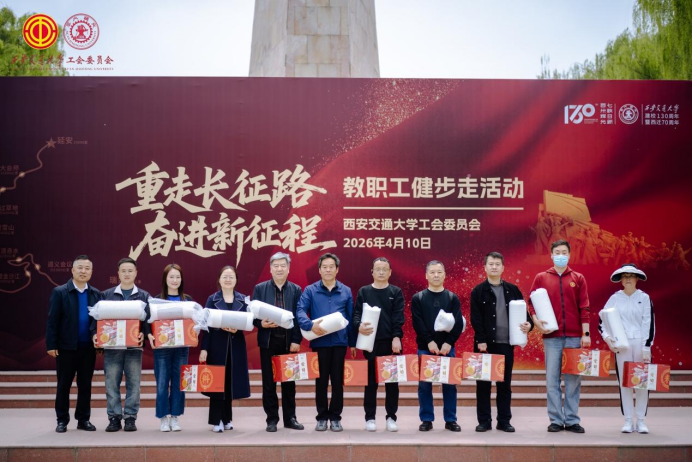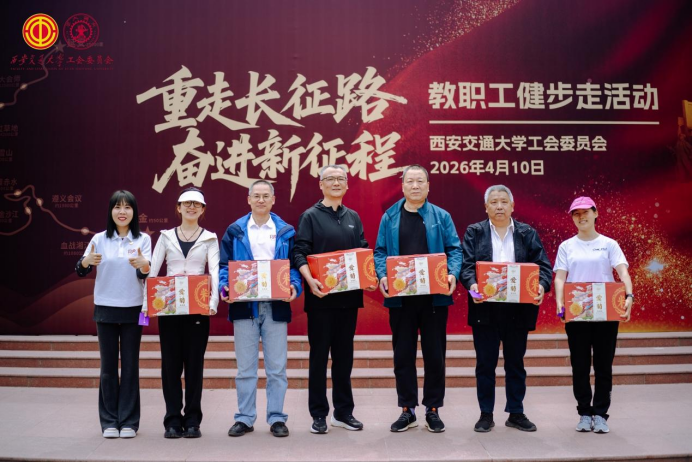 为纪念红军长征胜利90周年,传承弘扬长征精神与西迁精神,丰富教职工精神文化生活,引导广大教职工强健体魄、砥砺意志,4月10日,西安交通大学“重走长征路 奋进新征程”教职工健步走活动启动仪式在兴庆校区腾飞塔广场隆重举行。200余名教职工代表及20余家合作企业代表共同参与,西安爱菊集团总经理贾婧,西安交大工会常务副主席弋景峰、副主席董娜出席活动,仪式由校工会副主席谢志锋主持。