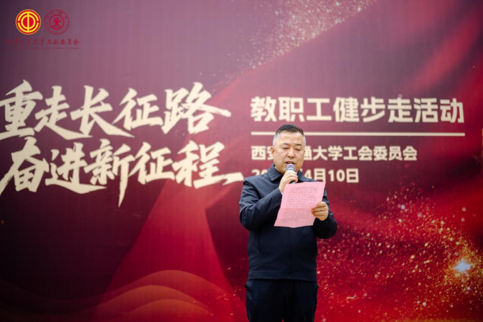 启动仪式上,弋景峰首先向莅临现场的全体教职工、企业代表表示热烈欢迎,向长期关心支持学校事业发展、积极助力教职工福祉建设的各企业单位致以诚挚感谢。他指出,2026年是红军长征胜利90周年,同时也是西安交通大学建校130周年暨西迁70周年,在这双重历史节点开展健步走活动,是学校工会将思想政治引领融入教职工服务工作的重要载体。活动旨在引导广大教职工在健步走活动中感悟革命先辈的艰苦奋斗与理想信念,把长征精神、西迁精神深度融入立德树人、科研报国的本职工作,以健康体魄与昂扬姿态投身学校高质量发展建设。