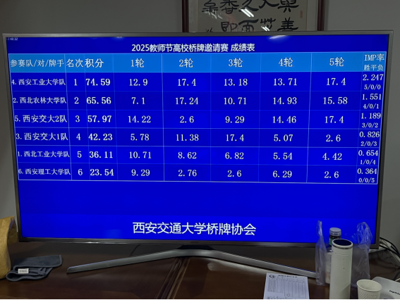 本次比赛共有6支队伍参加了比赛:西北工业大学队、西北农林大学队、西安工业大学队、西安理工大学队、西安交大1队和西安交大2队。赛制为5轮单循环队式赛,每轮12副牌,按循环轮次表对抗。经过5轮共60副牌的激烈角逐,裁判刘观伟宣布比赛成绩:“西安工业大学队”勇夺冠军,“西北农林大学队”获得第二名,“西安交大2队”获得第三名。西安交大老教授们组成的“西安交大1队”获得了第四名,老先生们一直以来对桥牌的热爱和对交大桥牌运动的支持,值得我们尊敬和学习。